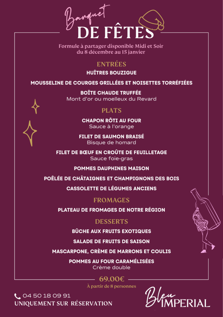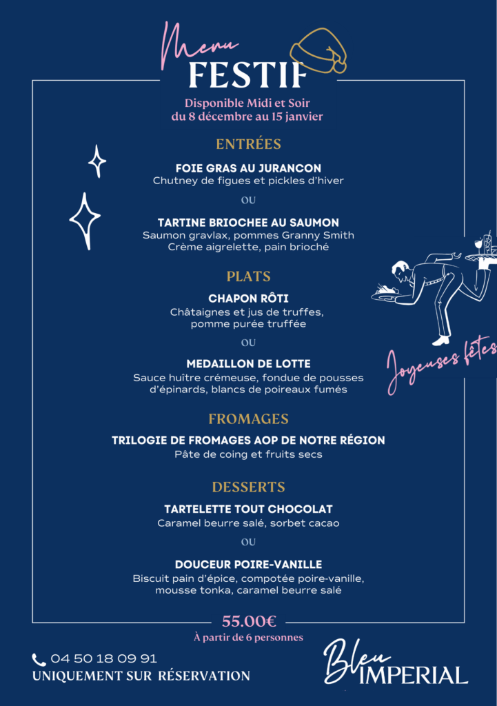 Le Bleu Imperial vous propose des menus festifs d’exception : le Menu des Fêtes pour 6 personnes et la Banquet de Fêtes à partir de 8 convives.